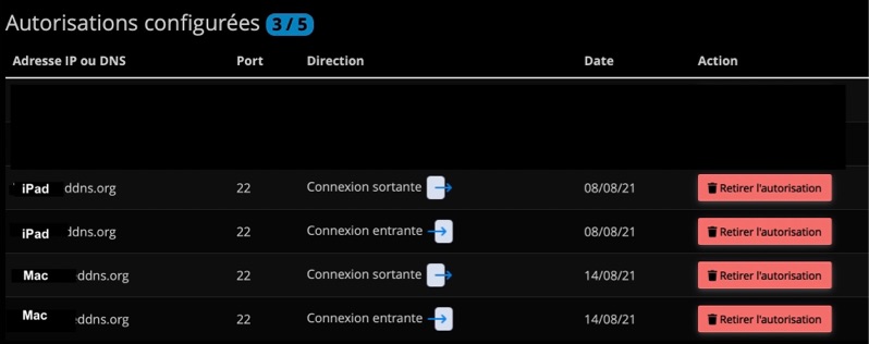 Pour que le serveur distant reconnaisse le Mac et l’iPad, j’ai indiqué dans ses paramètres les deux noms d’hôtes du type monordinateur.dynuddns.net et matablette.dynuddns.net. Les adresses attribuées par ProtonVPN étant des adresses statiques, qui ne changent pas, tant qu’on ne s’est pas déconnecté du VPN, je peux ainsi me connecter au serveur distant facilement, depuis les deux appareils simultanément.