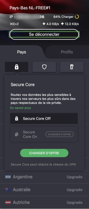 Un autre avantage, c’est que ProtonVPN offre des adresses IP statiques. Il ne s’agit pas d’adresses dédiées, c’est-à-dire qu’elles ne sont pas attribuées toujours au même utilisateur, mais elles sont statiques dans le sens où si l’on ne se déconnecte pas du VPN, on conserve la même adresse, y compris lors des mises en veille. ProtonVPN ne propose pas (encore ?) d’adresse dédiée, une des raisons en est que celle-ci peut permettre de remonter plus facilement à l’utilisateur, alors qu’une adresse statique, si elle « stabilise » sa connexion, change à chaque déconnexion/reconnexion au service.
