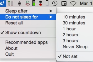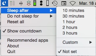SleepTime, accessible depuis le Mac App Store, permet de spécifier le délai pour l’extinction (Sleep after x minutes) ou la non mise en veille du Mac (Don’t sleep for x minutes). Il suffit de cliquer sur l’icône dans la barre de menu et d’indiquer la durée souhaitée.