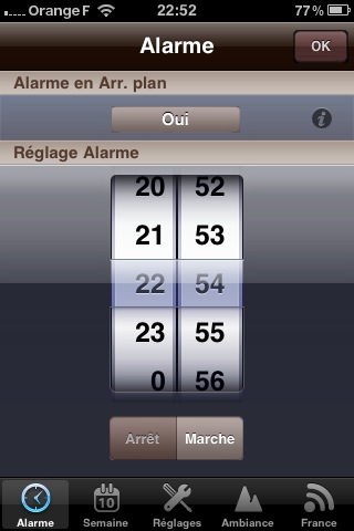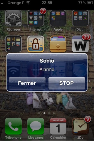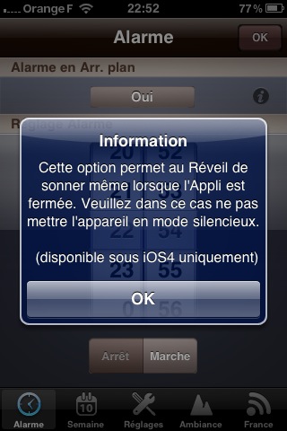 Parmi diverses améliorations (1), celle que tout le monde attendait 😉 l’alarme se déclenche même si l’application est fermée. Cette fonctionnalité n’est possible qu’avec iOS4.