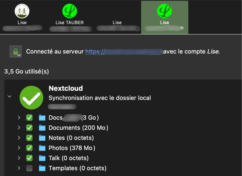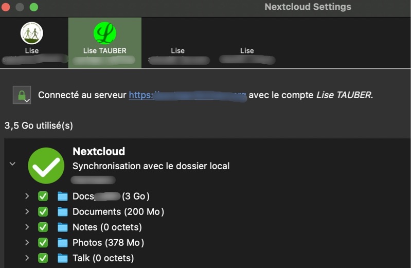 Il est aussi possible, avec l’application Nextcloud pour iOS et Android, de configurer plusieurs serveurs Nextcloud ; il faut alors choisir lequel est actif. Chaque application compatible, quelle que soit la plateforme, Mac, Windows, iOS, Android peut être paramétrée indépendamment.