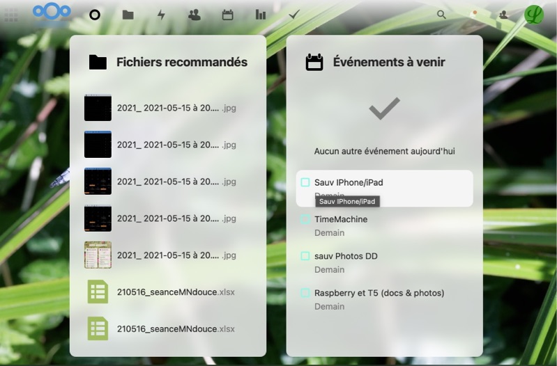 Notre hébergeur, o2switch, met à disposition de ses clients une instance Nextcloud. Cela signifie que je n’ai rien à configurer, juste à sélectionner les applis que je souhaite utiliser (calendriers, contacts…) et à synchroniser mes données…