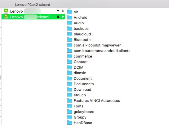 Dès que le smartphone est « vu » sur le Mac, on accède aussitôt à son contenu, et à celui de la carte mémoire, si celle-ci est installée. A noter que le stockage du téléphone est « vu » comme « sdcard », mais il s’agit bien de la mémoire interne. Les répertoires et fichiers du téléphone s’affichent dans le Finder comme n’importe quel dossier de l’ordinateur. On peut donc réaliser l’ensemble actions des habituelles du Finder.