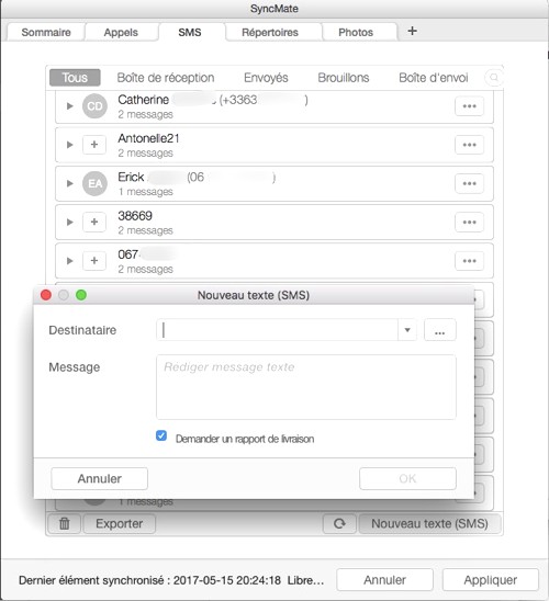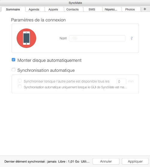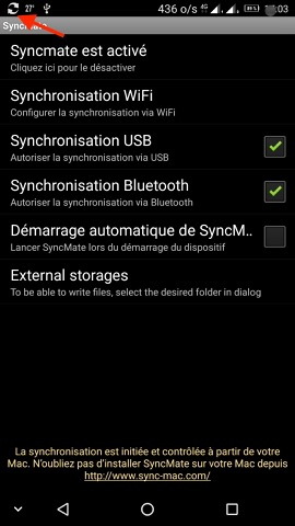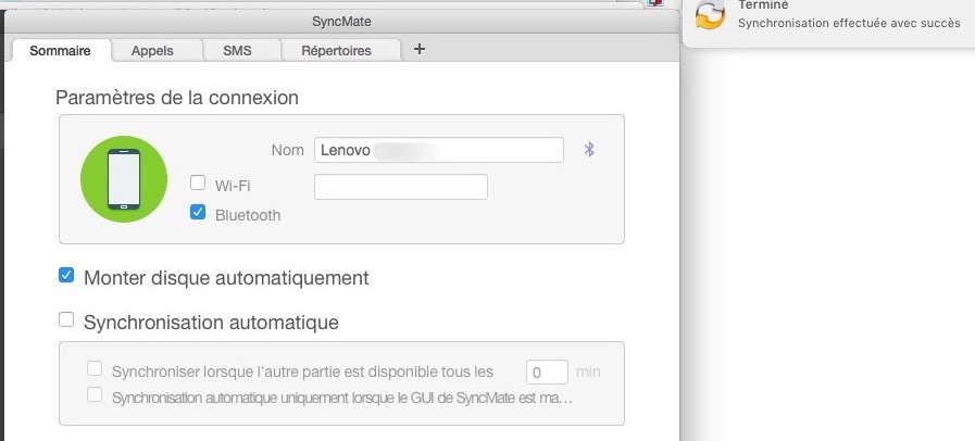 SyncMate est la plus conviviale des applications que j’ai testées. Elle permet de synchroniser ses données en WiFi (y compris quand on utilise le partage de connexion WiFi), en Bluetooth et en USB entre son smartphone, qu’il soit sous Android ou iOs et son Mac.