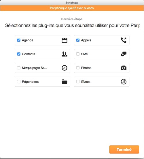On peut choisir les éléments que l’on souhaite synchroniser, agenda, contacts, SMS… répertoires…, le sens de synchronisation…