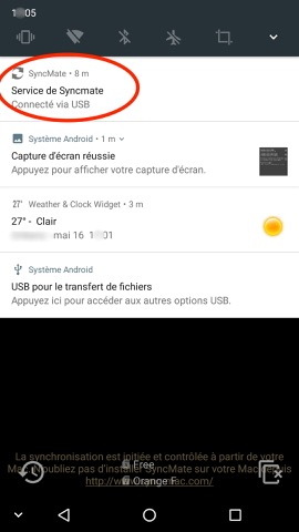 L’écran de notifications comme la barre d’état indiquent la synchro en cours.