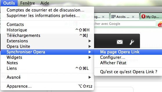 Parfois, la synchronisation n’est pas immédiate, on peut l’accélérer en allant sur sa page Opera Link (Outils > Synchroniser Opera > Ma page Opera Link).