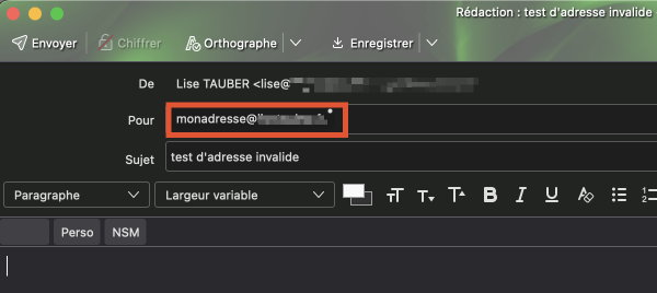 Avec les autres clients de messagerie, bien souvent, lorsqu’on saisit une adresse erronée lors de l’envoi d’un message, il faut attendre de recevoir un mail de son fournisseur d’adresses pour savoir qu’on a commis une erreur. Thunderbird signale avant l’envoi du message que l’adresse saisie n’existe pas (images 1 & 2).