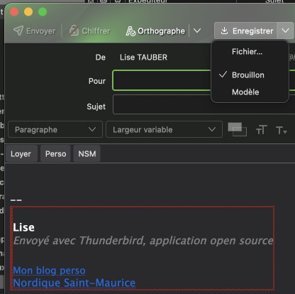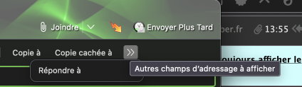 • Envoyer plus tard ouvre une boîte de dialogue permettant d’indiquer quand le message sera envoyé : on peut spécifier une date et heure précises, ou définir un délai ou cliquer sur Envoyer plus tard pour utiliser la fonction native de Thunderbird (copie le message dans la boîte d’envoi) ;