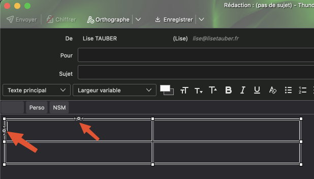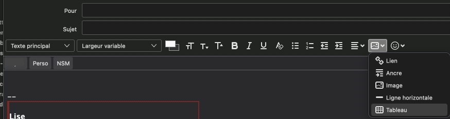 On peut enregistrer un message comme brouillon bien sûr, mais aussi comme modèle (image 6). On peut créer et modifier un tableau directement dans un message (trois dernières images).
