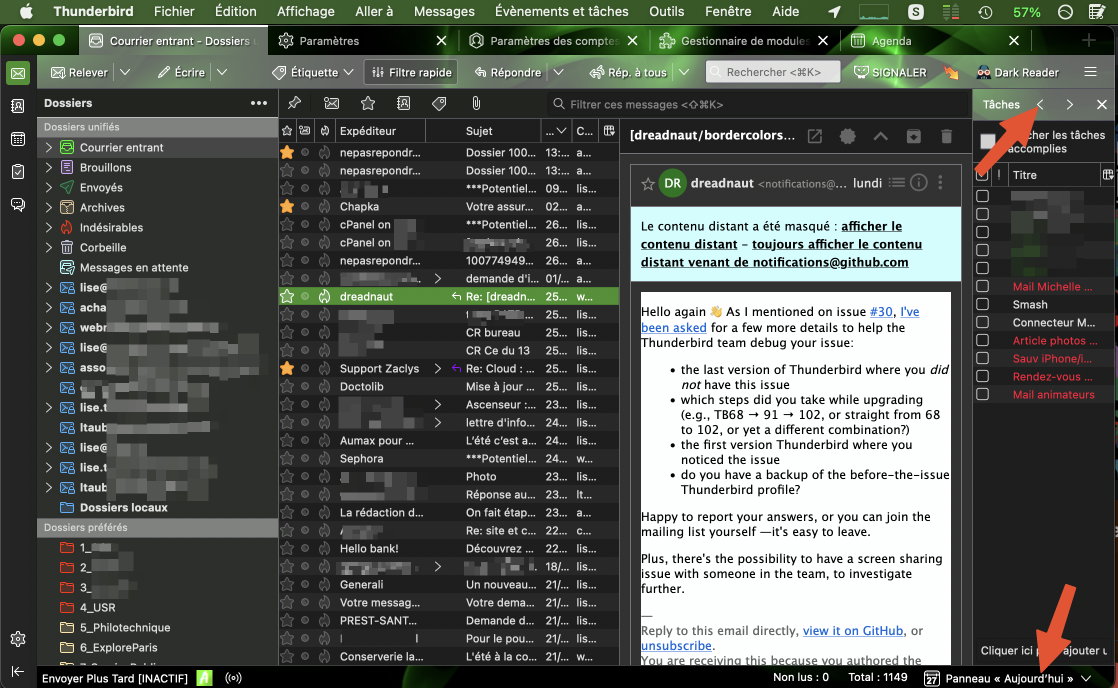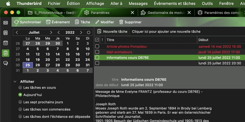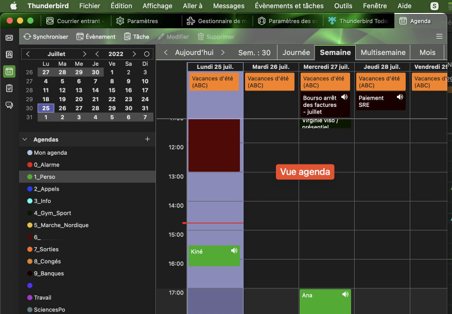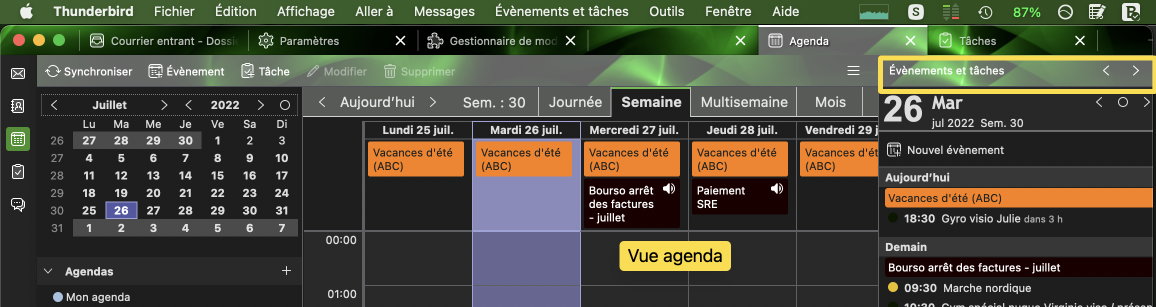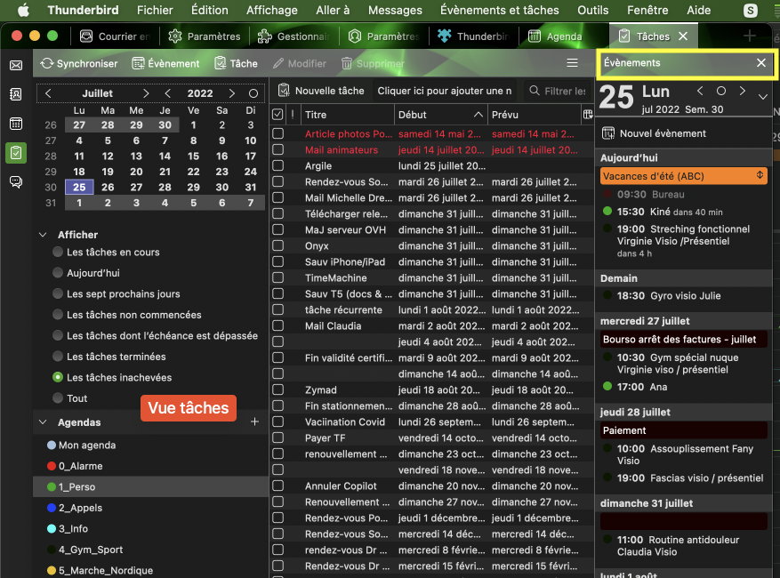 Thunderbird dispose d’un agenda et d’un gestionnaire de tâches. Les tâches ne s’affichent pas dans l’agenda, c’est dommage, mais depuis n’importe quel onglet, mails, agenda ou tâches, on peut sélectionner l’agenda, les tâches ou les deux dans la barre latérale.