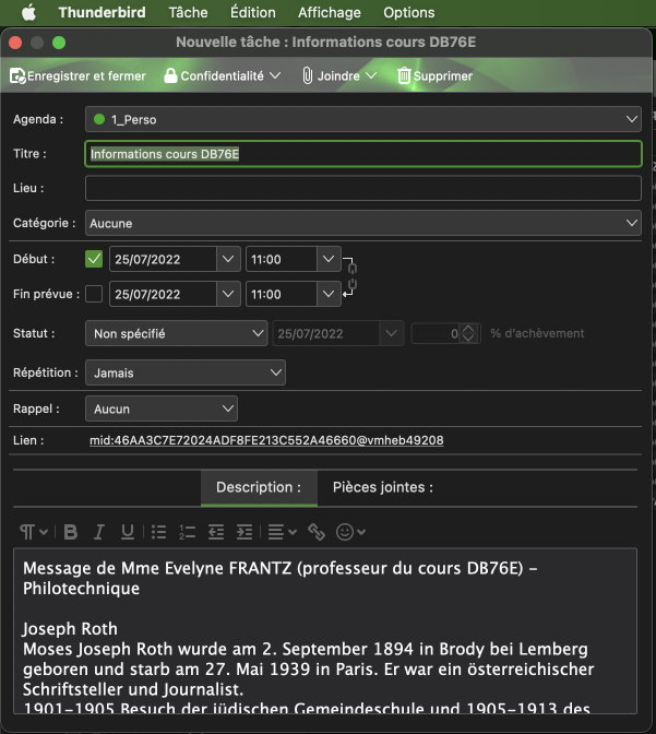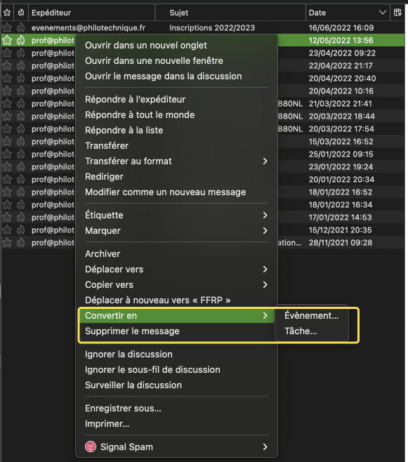 Et surtout, ce qui est pratique, on peut ajouter un mail facilement comme événement ou tâche ; si le calendrier est synchronisé via un nuage, on retrouve ce dernier directement dans son application favorite de calendrier.
