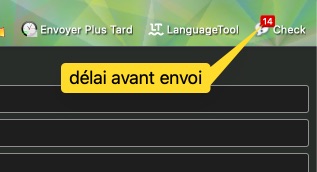 On peut également contrôler que les mots que l’on a prédéfinis sont présents dans le message, si le message ne contient pas de pièce jointe, si les destinataires existent ou non dans les carnets d’adresses… On peut définir le délai avant l’envoi du courriel. L’extension comprend de nombreuses autres options.