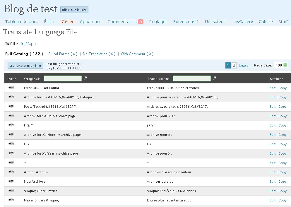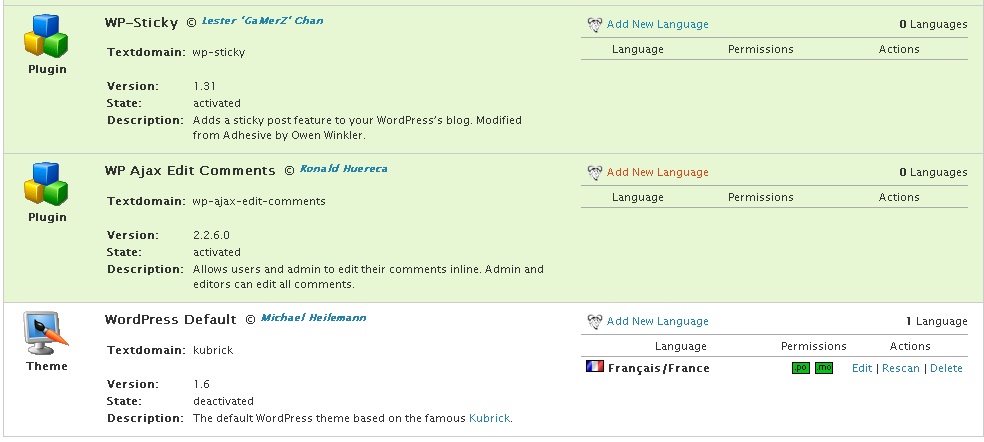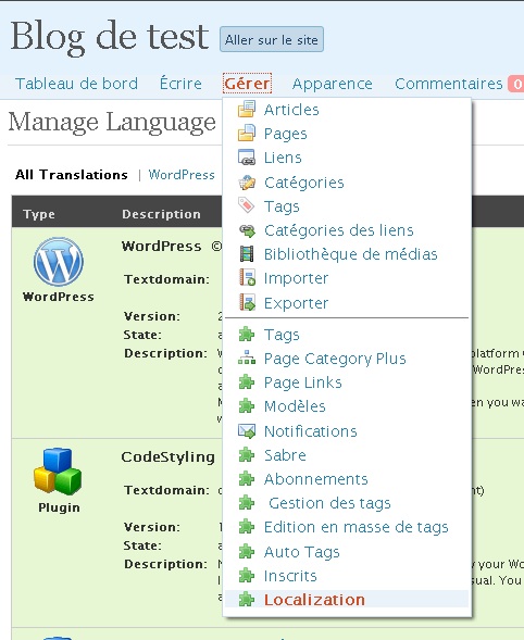 Certains développeur ne prennent pas le temps d’internationaliser correctement leurs plugins, ou alors ils ne respectent pas les spécifications I18n. Cela donne pour résultat que l’on ne peut accéder aux fichier de traduction depuis l’interface du plugin.