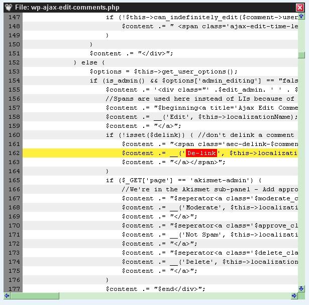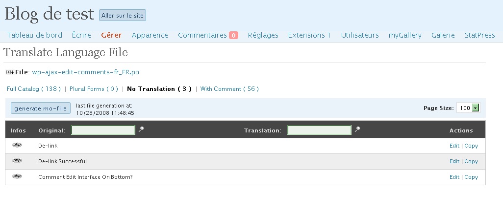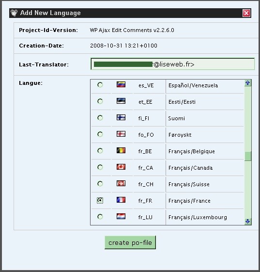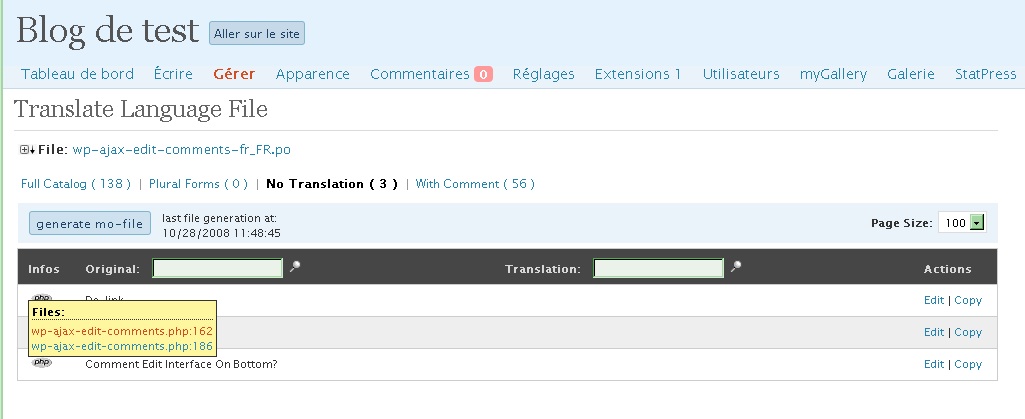 Autre limitation : pour reprendre la traduction déjà effectuée que je souhaitais mettre à jour, j’ai copié mon ancien fichier .pot dans le répertoire wp-content/plugins/. Codestyling Localization s’attend à trouver un fichier de traduction qui porte le même nom que le plugin : il m’a fallu alors renommer mon fichier ajaxEdit-fr_FR.mo en wp-ajax-edit-comments-fr_FR.po pour qu’il soit « vu » du plugin.