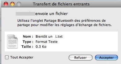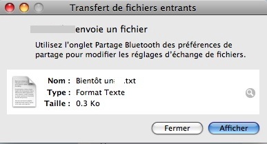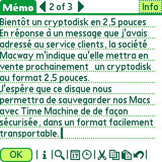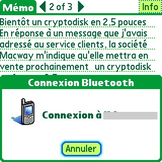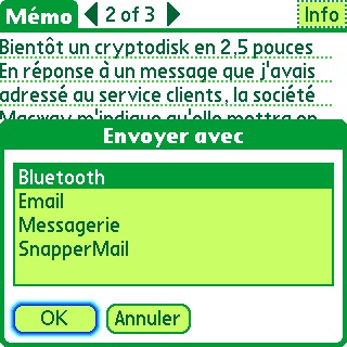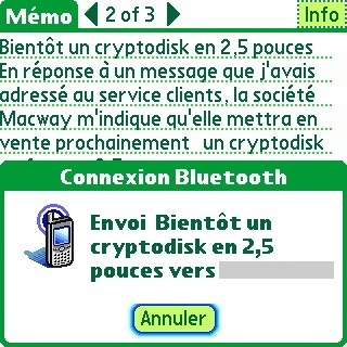 J’ai commencé à écrire sur mon Tréo 680 un petit article pour ce blog, avec PsMemo. Depuis ce logiciel, il est possible de l’envoyer, via Bluetooth vers le Mac (en cliquant dans la barre de menu sur Enreg. > Envoyer memo).