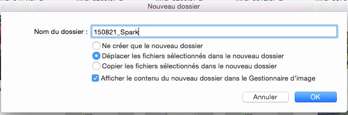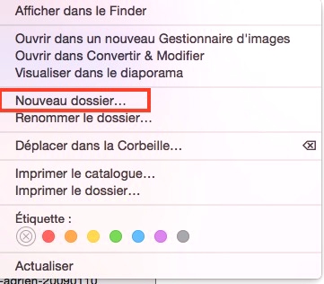Après avoir sélectionné les photos que l’on souhaite déplacer ou copier vers un nouveau dossier, un clic droit sur un dossier permet de créer un nouveau répertoire et de déplacer les fichiers en une seule manipulation.