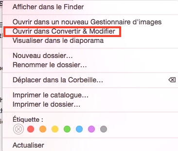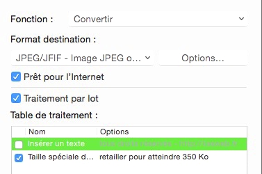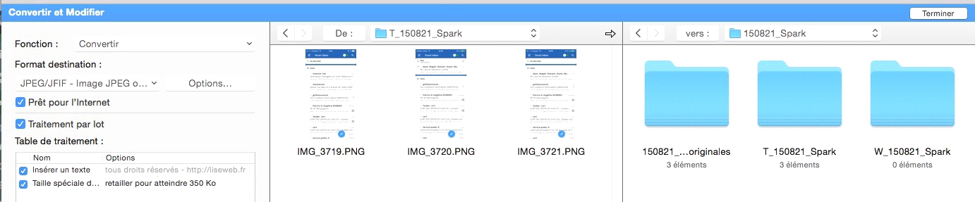 Un clic droit sur le dossier dans lequel se trouvent les images à traiter permet d’accéder à la fonction « Convertir et modifier ». On peut alors réaliser sa galerie en choisissant les options déjà existantes : ici, j’ai décoché l’option « insertion d’un texte » et conservé la réduction de taille à 350 Ko par image.