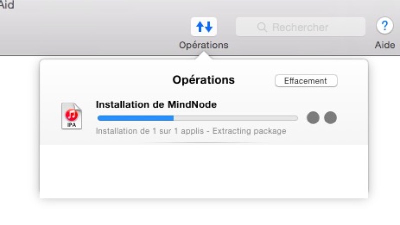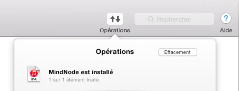 - copie de l’application MindNode de l’iPad vers le Mac en USB (images 1 à 3) sans les fichiers puisque je voulais tester le transfert de fichiers via iCloud ;
