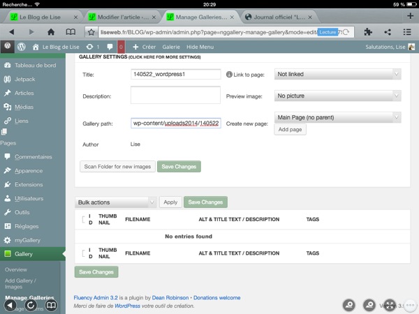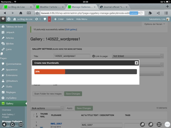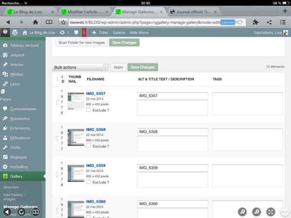 Puis je crée une nouvelle galerie avec NextGEN Gallery et télécharge les images avec Documents. J’importe ensuite les images dans la galerie.