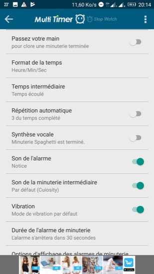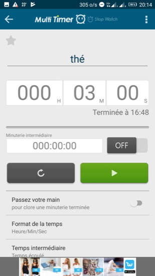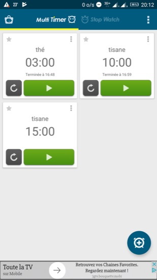 J’ai trouvé sur le Play Store une app sympa et gratuite, proposant d’afficher plusieurs minuteurs, soit dans l’app elle-même, soit sous forme de widget, il s’agit de Muti Timer StopWatch.