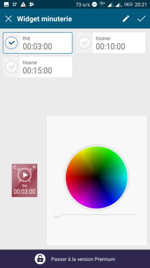 Après avoir glissé le widget d’un minuteur sur l’écran souhaité, une nouvelle fenêtre s’affiche, dans laquelle on choisit le minuteur souhaité et sa couleur.