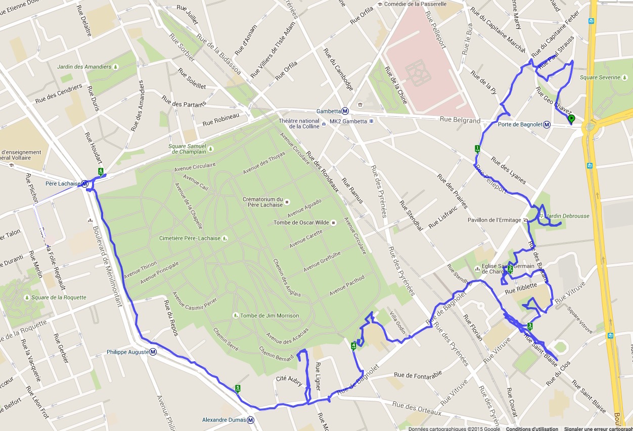 Ce qu’il manque à ce parcours, c’est la carte. J’ai donc enregistré mon parcours avec Walkmeter. Seule la fin ne correspond pas à la balade, à partir de la rue de Bagnolet jusqu’au boulevard de Ménilmontant.
