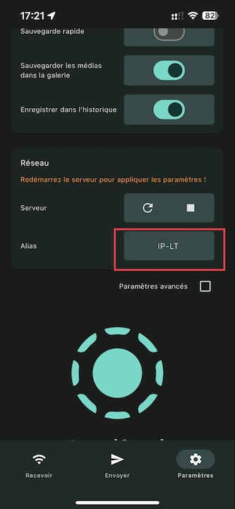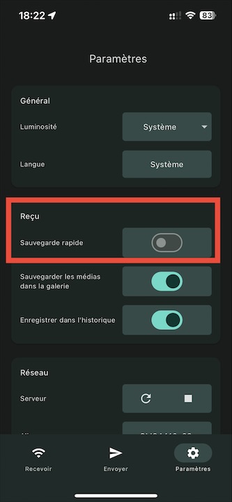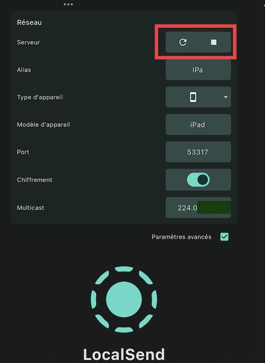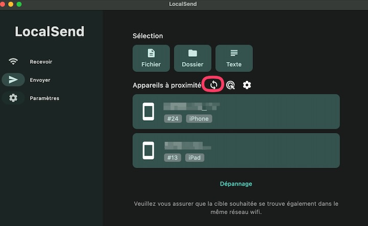D’autres options sont disponibles : sur le Mac, on peut sélectionner le répertoire de réception (image 1). Sur l’iPad et l’iPhone, on peut choisir d’accepter automatiquement, ou pas, les fichiers reçus (images 2 & 3). Il est possible d’envoyer un ou plusieurs fichiers simultanément sur plusieurs appareils (images 4 1 5), mais il faut bien sûr que sur chacun d’eux, LocalSend soit en position de réception. Si un appareil n’apparaît pas lors d’un envoi de fichier, un tap sur l’icône dédiée permet de rafraîchir la connexion (image 6). LocalSend est également accessible depuis la fonction Partage.