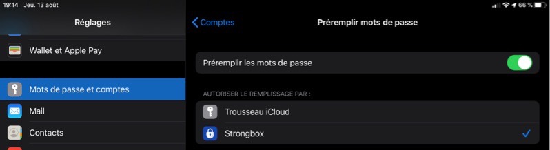 Dans les Réglages sur l’iPhone et sur l’iPad, je n’ai sélectionné que Strongbox et ai désactivé l’application Trousseau.