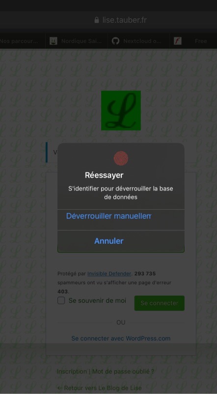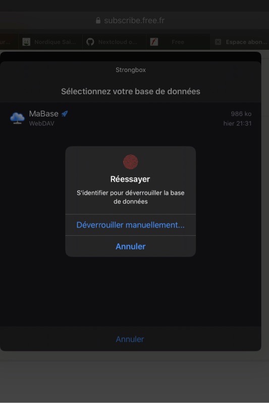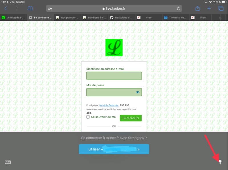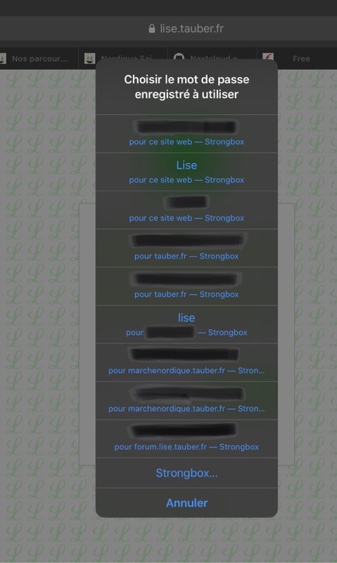 Strongbox propose directement le nom d’utilisateur et le mot de passe. Si le compte suggéré n’est pas celui qu’on souhaite utiliser, après un tap sur la petite clé en bas à droite, la liste des utilisateurs s’affiche. Une fois le compte sélectionné, il faut déverrouiller l’accès à Strongbox, le nom de l’utilisateur et le mot de passe sont saisis automatiquement