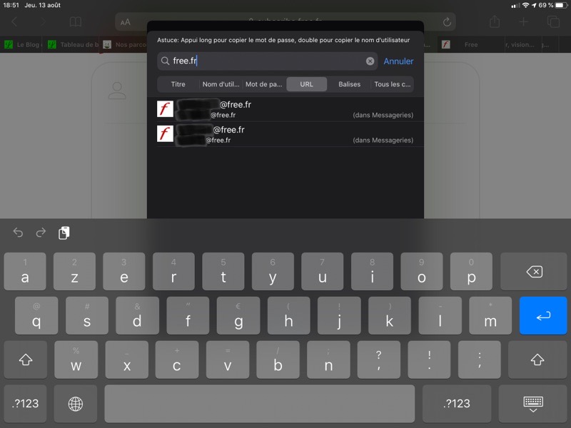Il est possible également qu’aucun mot de passe ne soit proposé. Après avoir effectué un tap sur Mots de passe, et déverrouillé l’accès à la base de données, les différents comptes sont affichés. Dans ce cas également nom d’utilisateur et mots de passe sont remplis automatiquement.