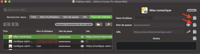 Il faut ouvrir l’application, puis avec un clic sur l’icône Copier, copier successivement le nom d’utilisateur et le mot de passe, et les coller dans les champs correspondants sur la page web.