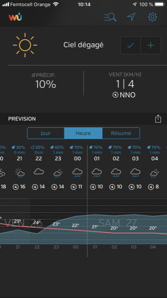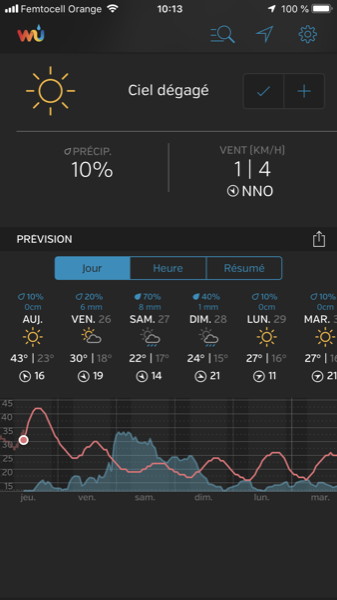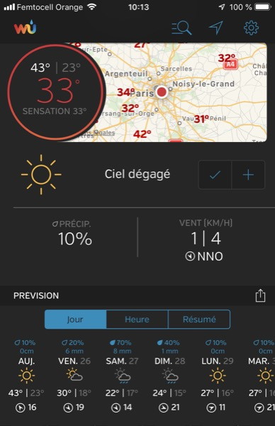 J’avais décrit au début de l’année Weather Underground (1), une application météo pour iPhone et Apple Watch, qui existe également pour Android. Si je l’avais choisie avant tout pour son ergonomie sur la montre, c’est en fait l’app que j’utilise par défaut y compris sur l’iPhone. Et par ces temps de canicule, elle m’est bien pratique pour prévoir (voire annuler) mes activités…