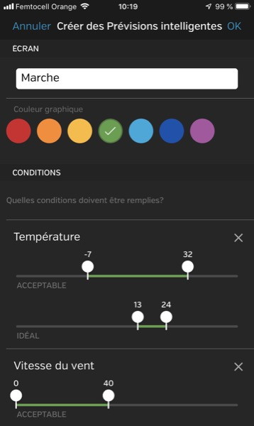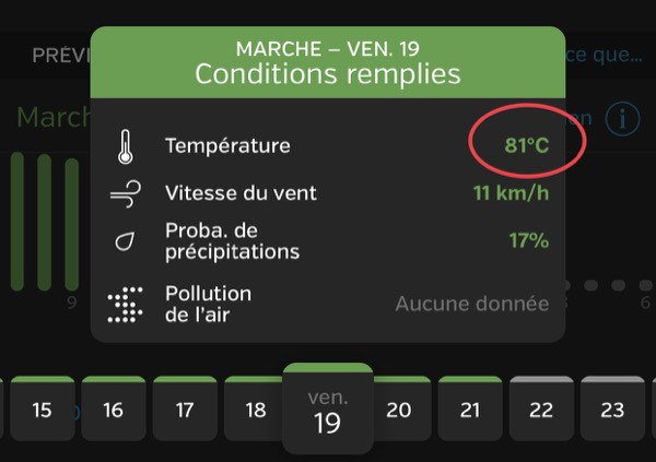 Comme je l’indiquais rapidement dans mon précédent article, on peut configurer différents écrans en fonction des activités que l’on mène (avec un petit bémol, les températures Fahrenheit ne sont pas toujours bien converties en degrés Celsius ! – dernière image)
